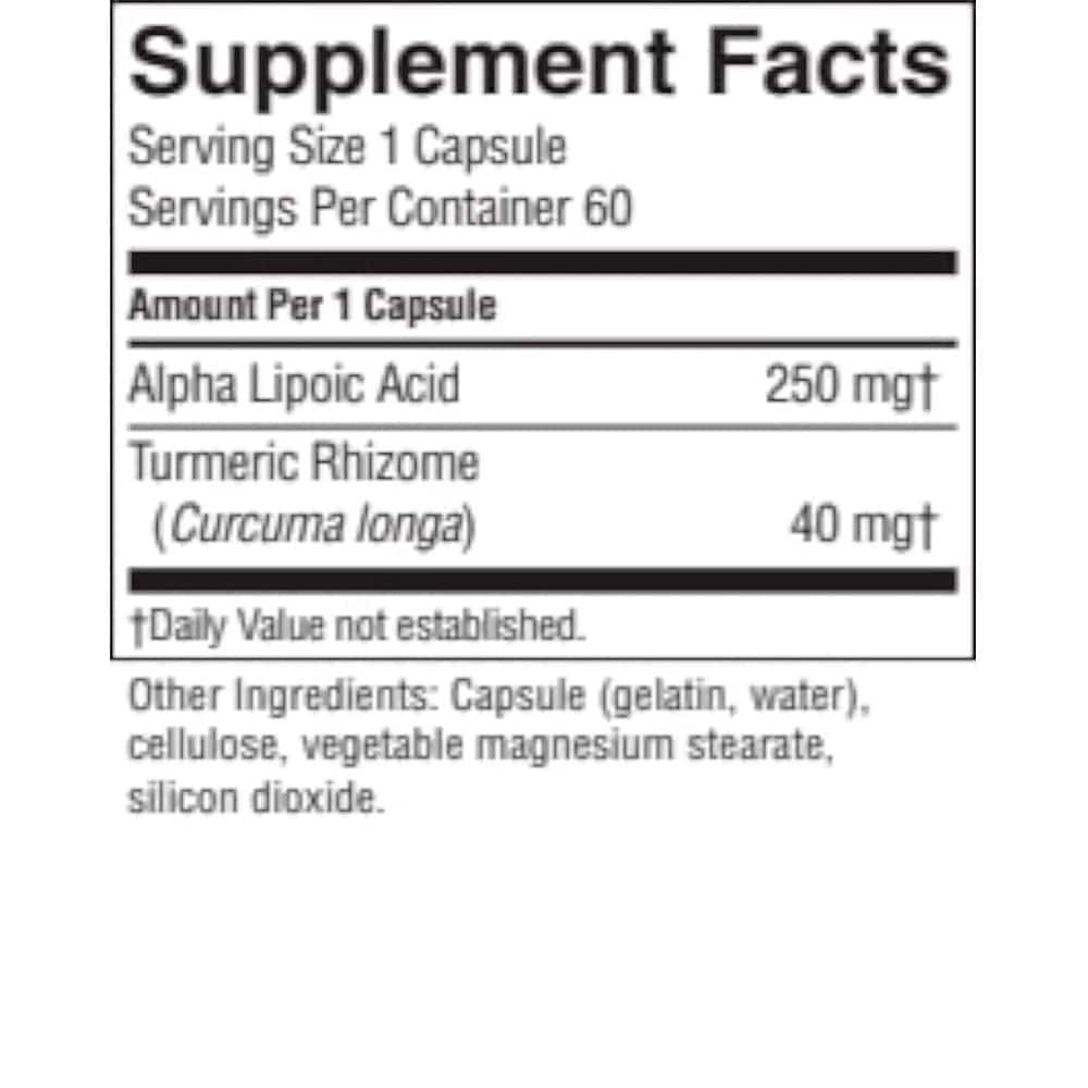 Cada cápsula contiene 250 mg. de ácido alfa lipóico y 40 mg de raiz de cúrcuma (turmeric)