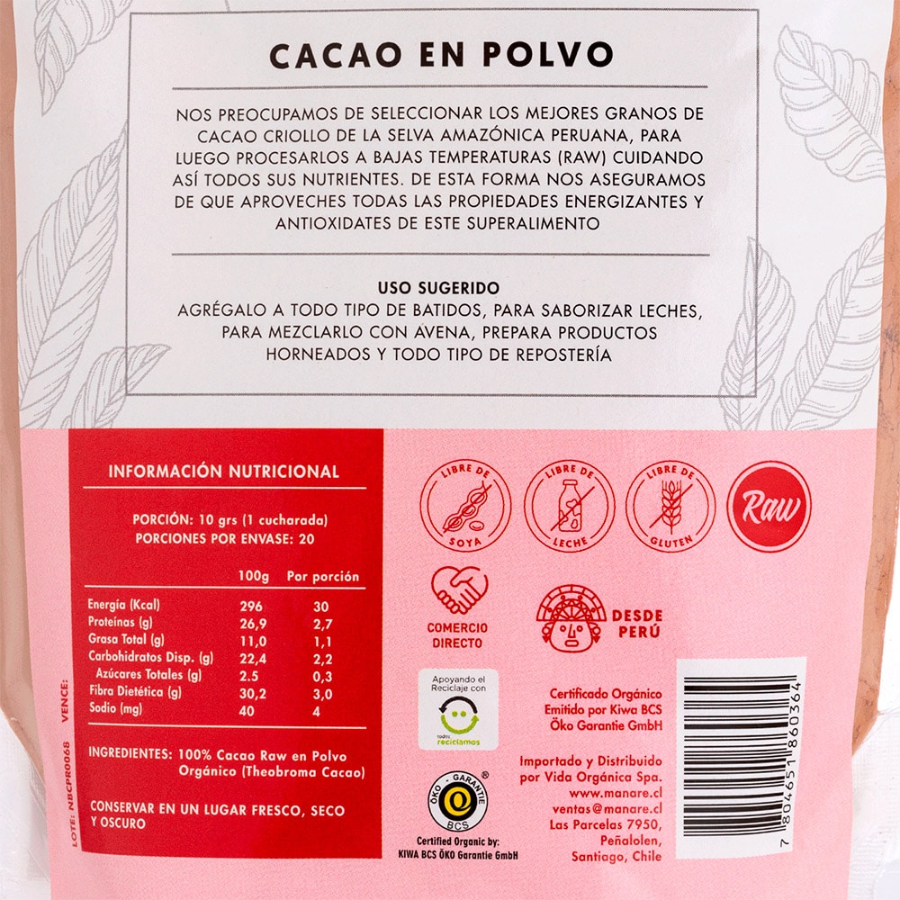 Ingredientes: 100% cacao en polvo orgánico.