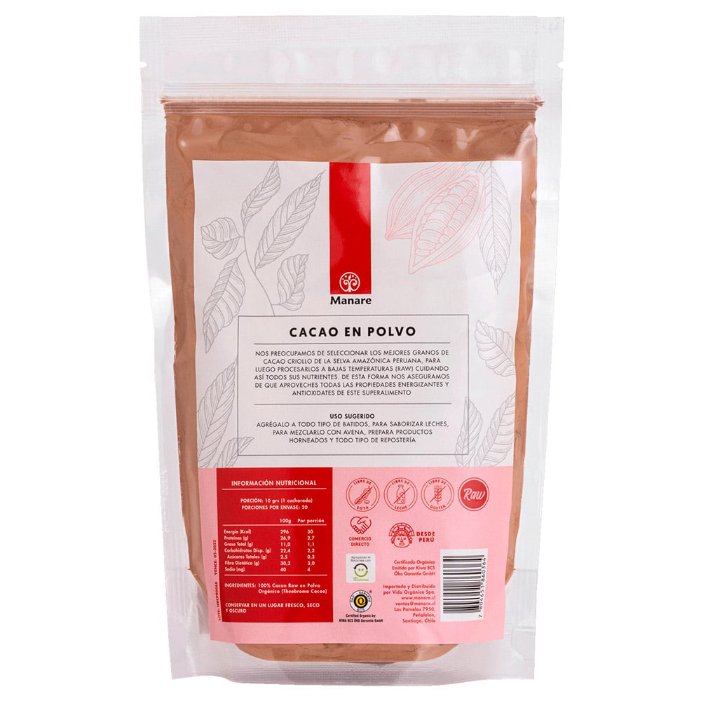 Cacao en polvo orgánico 200 gr, Manare