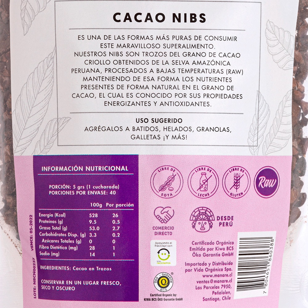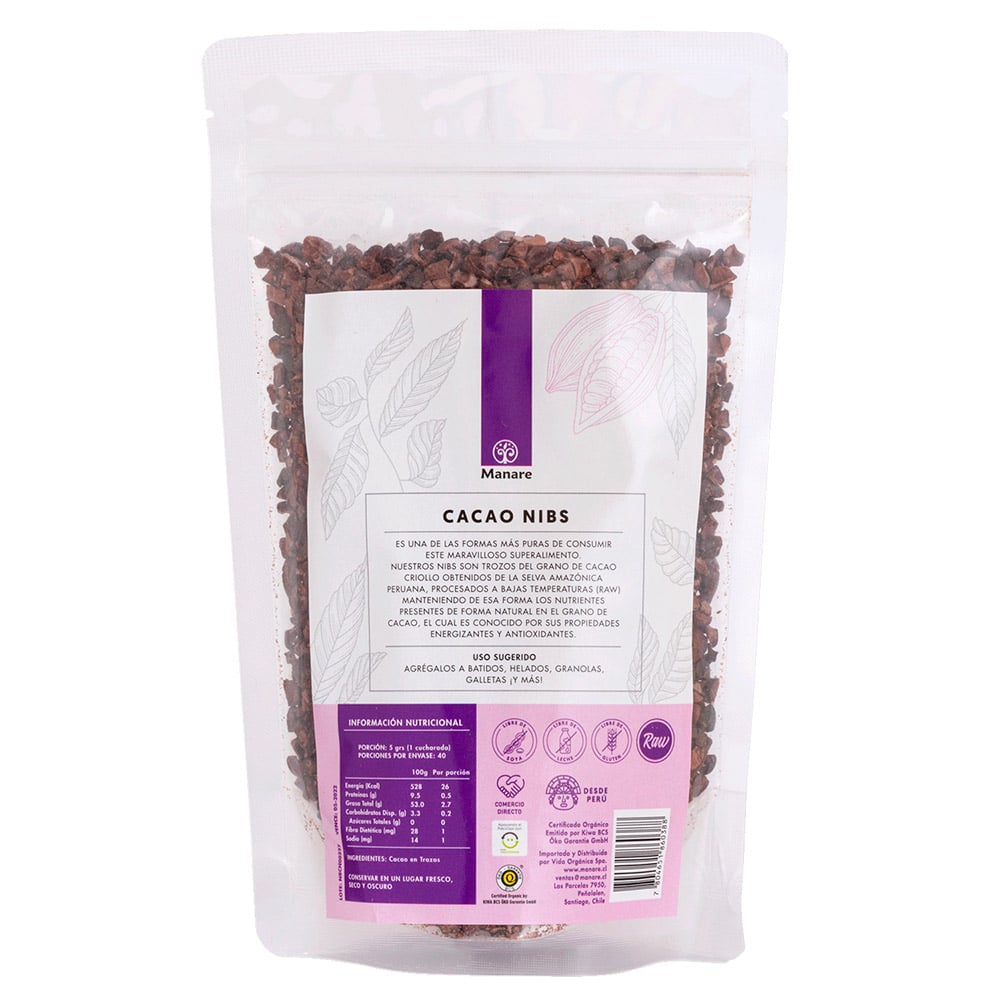 Cacao Nibs Orgánico 200 gr, Manare