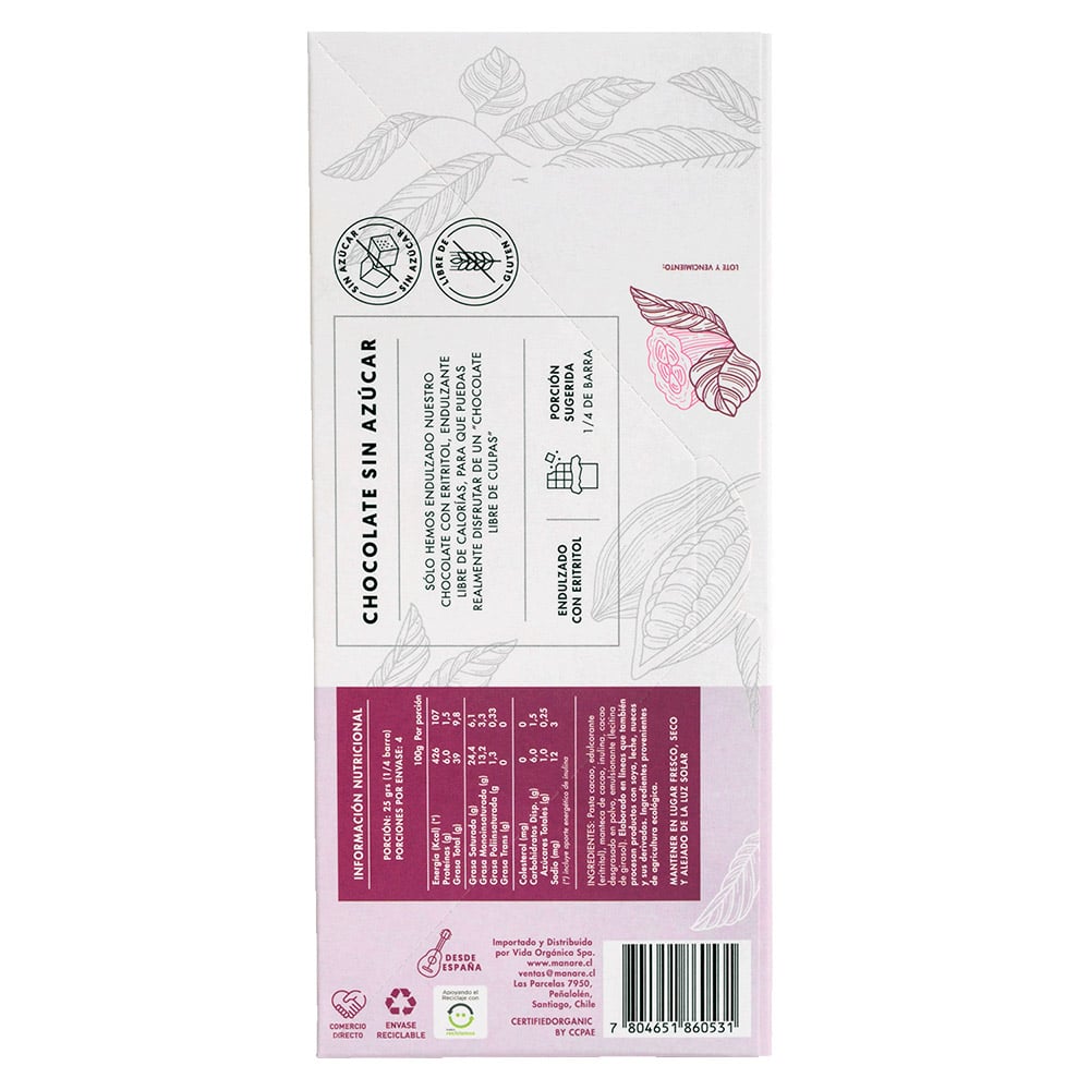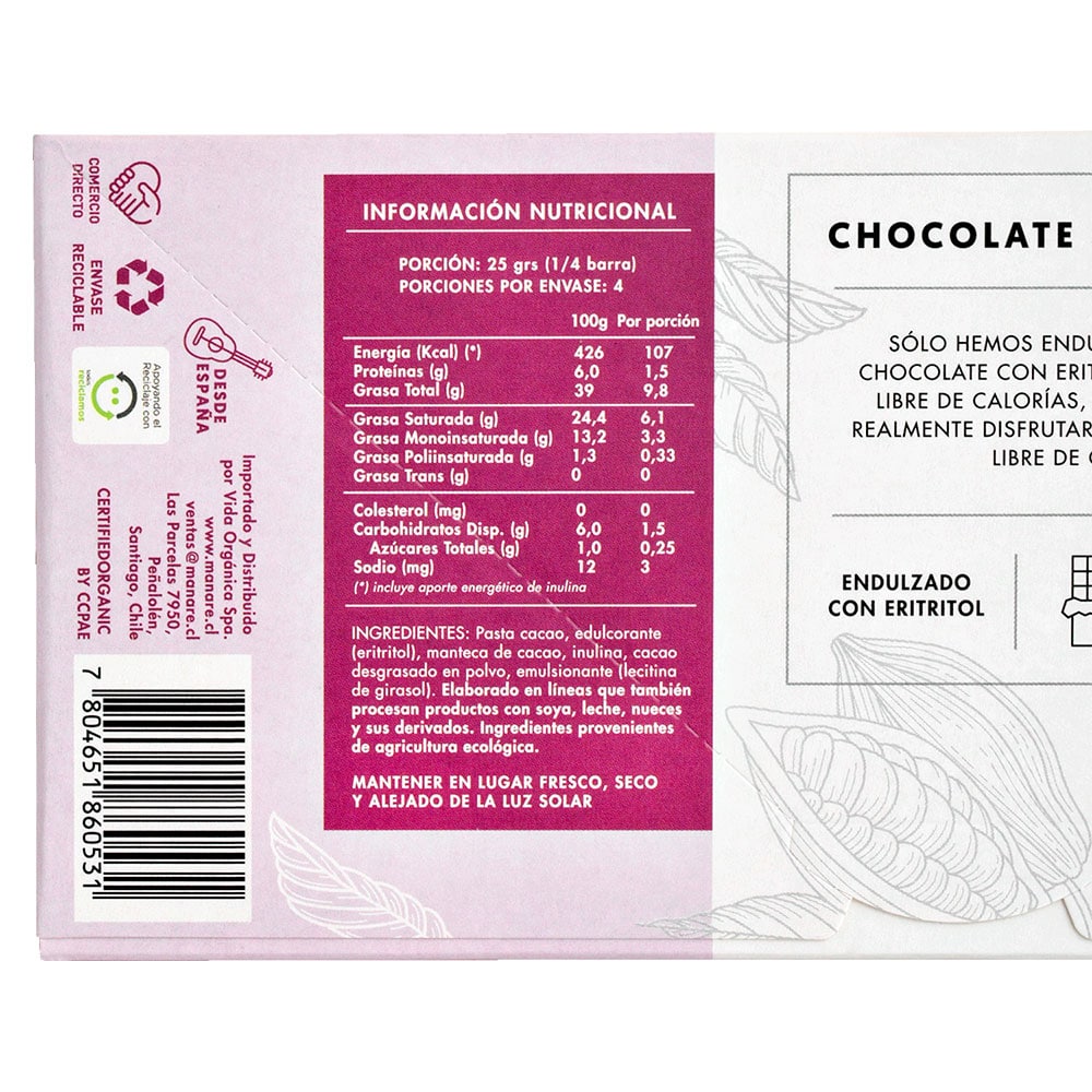 Ingredientes: pasta de cacao, eritritol, manteca de cacao, inulina, lecitina de girasol. Ingredientes provenientes de agricultura orgánica.