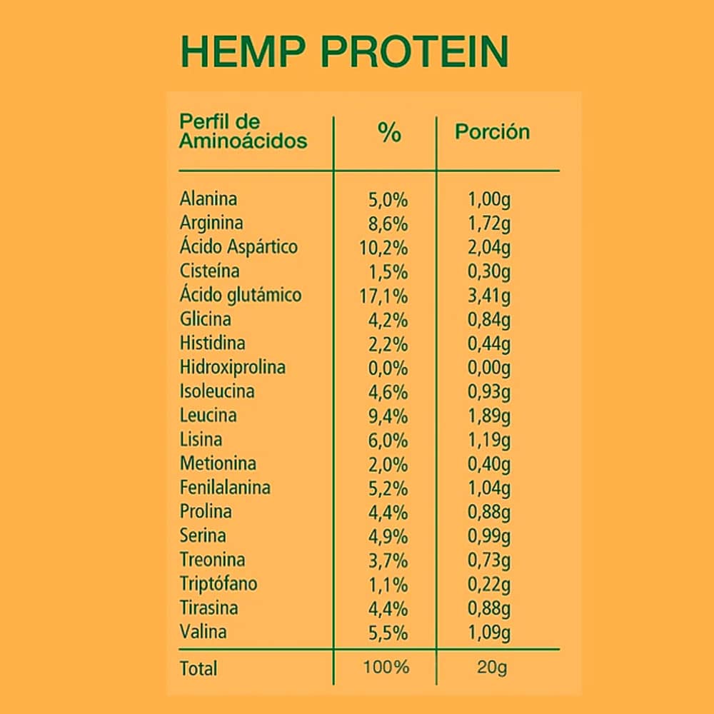 Hemp Protein es una de las mejores fuentes de proteína vegetal, con un completo perfil de aminoácidos y excelente asimilación, puede ser usado como la principal fuente de proteínas en la dieta. Además es muy rico en minerales y vitaminas, donde destaca su aporte de hierro, fósforo y magnesio, entre otros.