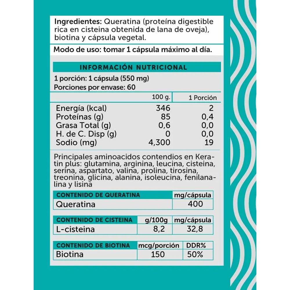 Keratin plus contiene Queratina, una proteína de alta digestibilidad obtenida de lana de oveja. Es rica en Cisteína, Leucina y Glutamina, nutrientes que favorecen la producción endógena de colágeno del tipo IV y del tipo VI, los cuales dan firmeza a la unión entre las primeras capas de la piel (Dermis y Epidermis).