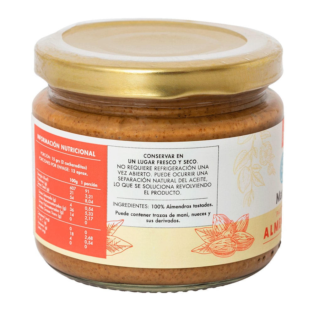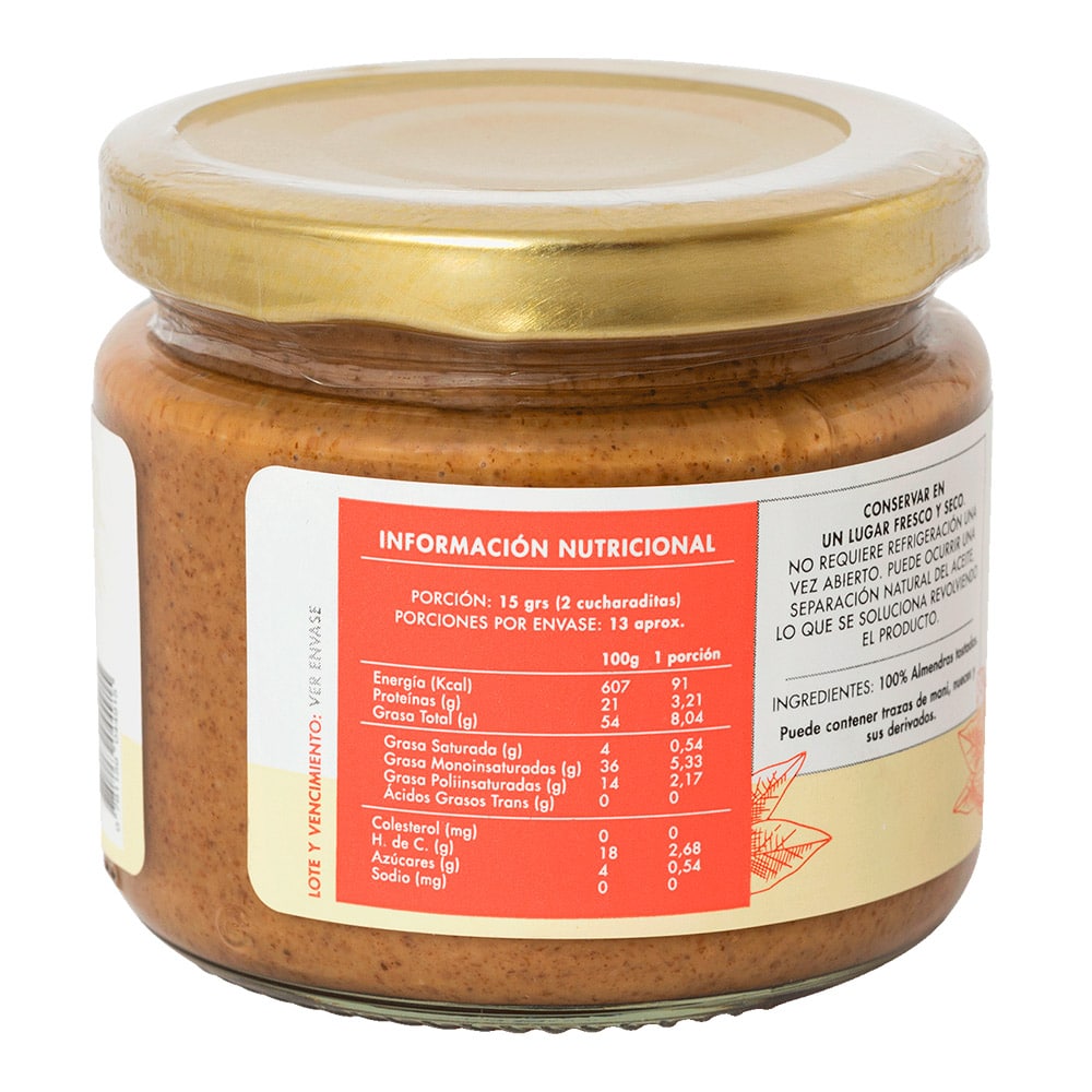 Mantequilla de almendras 100% natural, sin aditivos, sin sal ni azúcar añadidas.