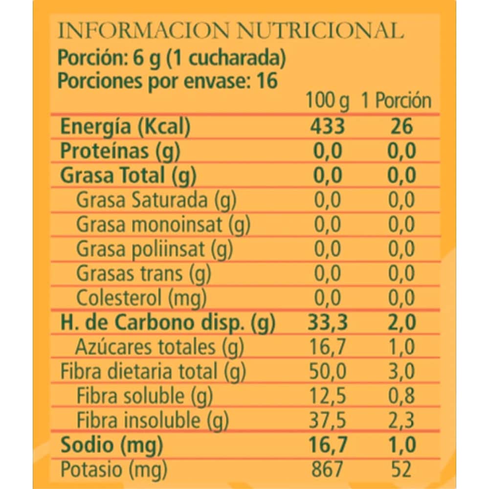 Buena Fuente de Fibra. Libre de Soya. Libre de Lactosa. Libre de Gluten. Sin azúcar añadida. Sin saborizantes, preservantes ni colorantes. Puedes incorporarlo en tu dieta preparando jugos naturales o agregarlo al yogurt.