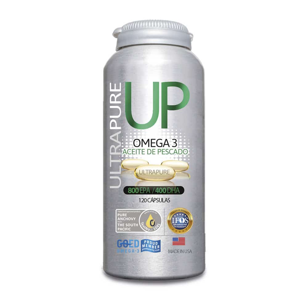 Omega UP UltraPure es un suplemento desarrollado con Aceite de Pescado de alta concentración de EPA y DHA, llegando a 600 mg de ácidos grasos EPA y DHA por cada cápsula de 1 gr.