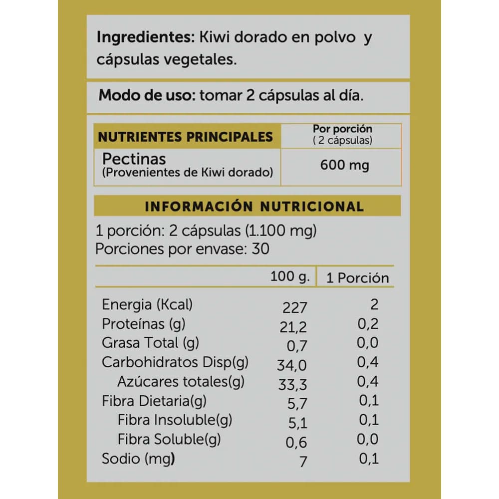 - Pectinas naturales provenientes de kiwi dorado: 600 mg