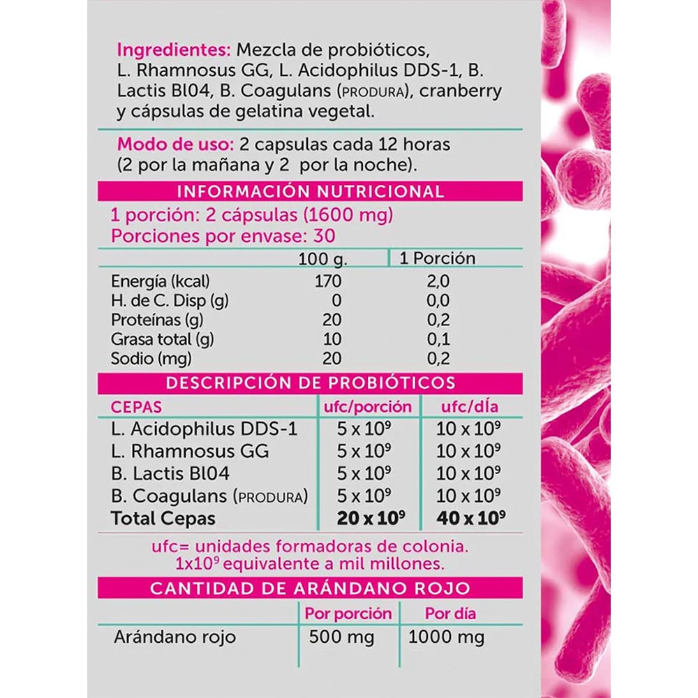 Mezcla probiótica sinérgica, L. Acidophilus DDS-1, L. Ramnosus GG, B. Lactis BL04 y B. Coagulans (PRO DURA). Las cepas probióticas más estudiadas, elegidas especialmente para que se potencien y no compitan entre sí. Arándano Rojo, cranberry orgánico, procedente de Canadá. Un ingrediente que puede ser efectivo para prevenir infecciones urinarias asociadas a la presencia de E.Coli.
