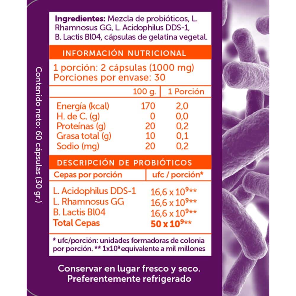 CONTINE CEPAS L. RHAMNOSUS GG, L. ACIDOPHILUS DDS-1, B. LACTIS BL04, B. COAGULANS (PRO-DURA), LAS MÁS ESTUDIADAS DEL MUNDO. + ESTABILIDAD + POTENCIA. CONTIENE 50 BILLONES DE UNIDADES FORMADORAS DE COLONIAS (UFC)