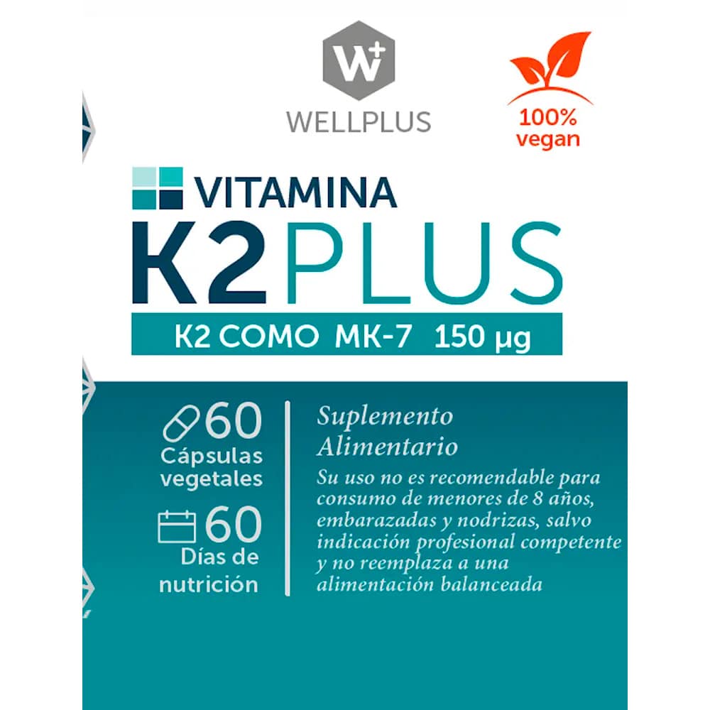 La vitamina K2 por su origen deberían ser aptas para veganos, sin embargo, muchas veces las cápsulas utilizadas no lo son, puesto que usan gelatina de origen bovino o porcino. Los suplementos Wellplus son diseñados con cápsulas vegetales para obtener un producto 100% VEGANO y con una alta eficacia biológica por ser la molécula correcta (K2 como MK-7) en el medio correcto (lecitina de girasol y aceite de coco (MCT). La vitamina K2 actúa sinérgicamente con la vitamina D3, razón por la cual una combinación de ellas maximizará sus beneficios. Una combinación de D3+K2 junto con Osteo Plus (calcio quelado y colágeno), potenciarán en particular los beneficios óseos.